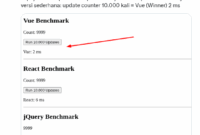 Update 01/12/25 ยท Read 8 min Di dunia pengembangan web modern, performa JavaScript menjadi faktor krusial, terutama ketika aplikasi harus menangani ribuan elemen di DOM … Continue reading Benchmark JavaScript Modern: Vue, React, dan jQuery
