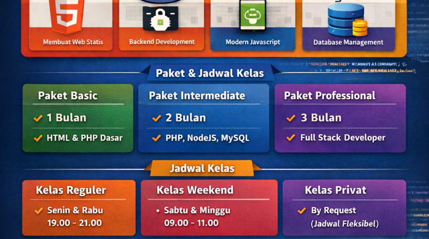 Perkembangan teknologi digital membuka banyak peluang karier baru. Jika kamu tinggal di Wonosobo, Jawa Tengah dan ingin masuk ke dunia IT, belajar koding adalah langkah … Continue reading Belajar Koding Wonosobo : HTML, PHP, NodeJS & MySQL (Private)